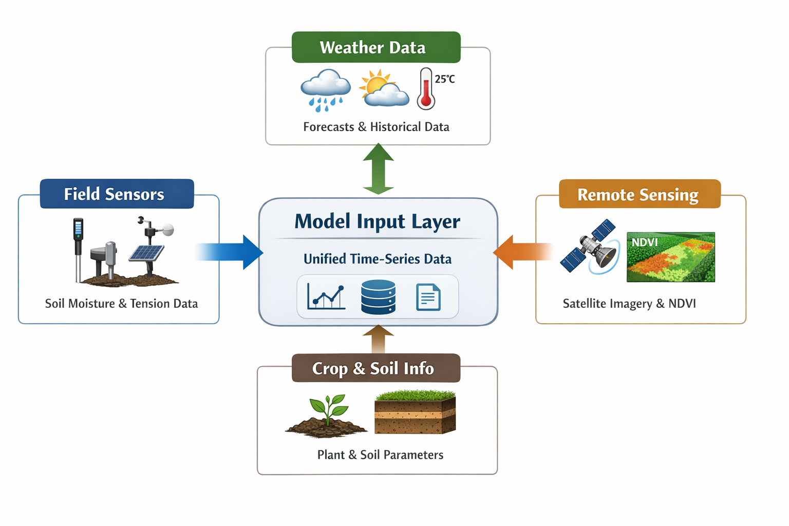 SoilCast addresses this challenge by building a unified Model Input layer. The pipeline ingests: